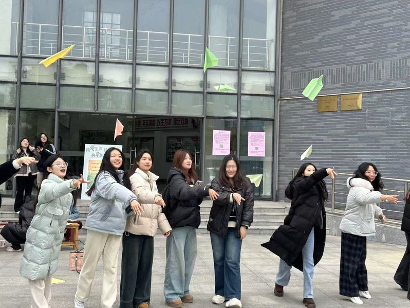 在“润心美愈,画解心情”绘画作品征集活动区域,同学们或三两成群轻声交流创作思路;或独自沉浸在对校园之美的回忆与勾勒中,用画笔细腻地描绘“我常走的校园小道”那熟悉的砖石纹理、斑驳树影,以及“被遗忘的小角落”中静谧的花草、陈旧的石凳。尽情抒发着内心深处的情感与对校园的独特感悟。即兴演奏环节设置在专门的音乐体验空间,温馨的灯光与舒适的座椅环绕四周。同学们怀揣着好奇与期待,或自信地拿起话筒唱出心中旋律;或在一旁专注聆听。在音乐的海洋里,他们放大感官系统,全身心地感受每一个音符的跳动,让压力随着旋律飘散,使情绪在节奏中得到舒缓与调和。emoji 表情猜词游戏区域充满了欢声笑语与紧张的氛围。贴纸上由一个个鲜活的emoji 表情组合而成的谜题,同学们围坐在一起,时而眉头紧锁,苦苦思索对应的四字汉语成语;时而灵感乍现,兴奋地喊出答案。在这一过程中,大家的观察力、成语知识储备以及联想能力都在无形之中得到了显著的提升。“烦恼远离”放飞烦恼大赛的场地选在开阔的室外。广场地上,同学们领取彩色的纸张,郑重地写下心中的烦恼,随后将其仔细折成形态各异的纸飞机。他们站在起飞线前,眼神中带着对烦恼告别的坚定,奋力将纸飞机掷向远方。纸飞机在蓝天绿地间划过一道道优美的弧线,仿佛烦恼也随之远去,现场的气氛热烈而又充满希望,同学们以这种独特且充满仪式感的方式,与烦恼挥手作别。